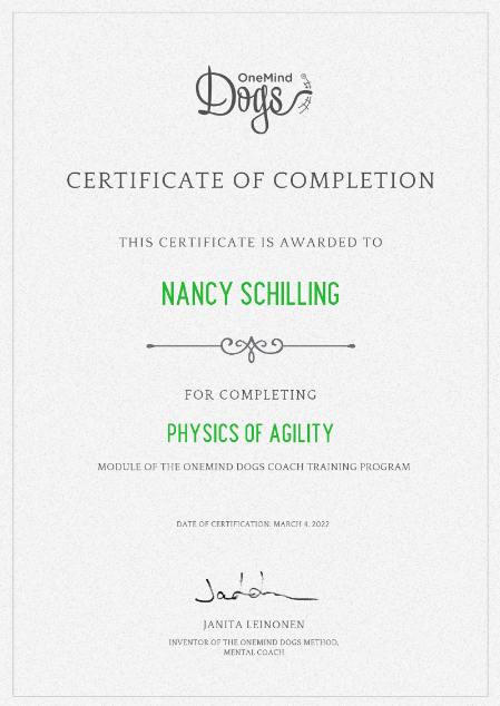 As a handler Nancy uses what she has learned from OneMind Dogs: to be the best partner she can for her dogs. “I love to learn and improve my handling and use of techniques for the best performance my dog and I are capable of” she says.